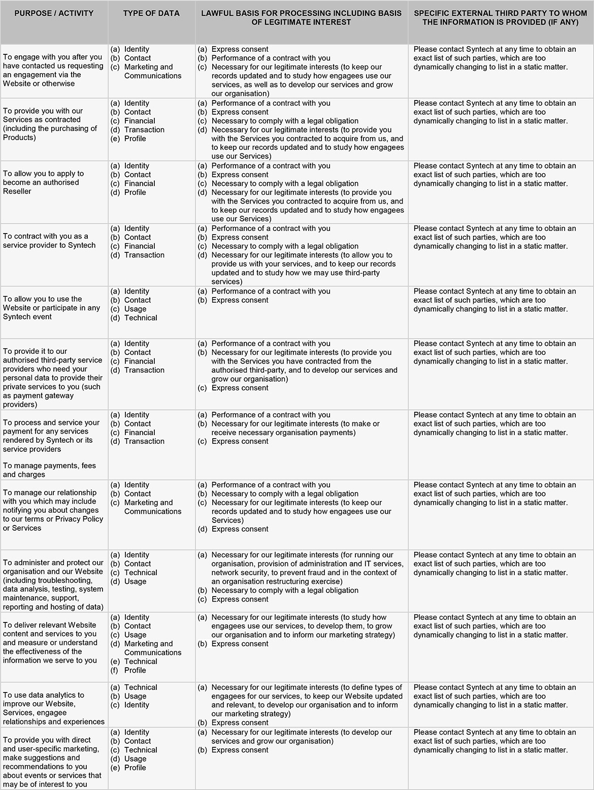 4.2.3.2. You will receive marketing communications from us if you have requested information from us, have participated in any Syntech service or event, or if you provided us with your details when registering for a promotion or event and, in each case, you have not opted-out of receiving that marketing.
