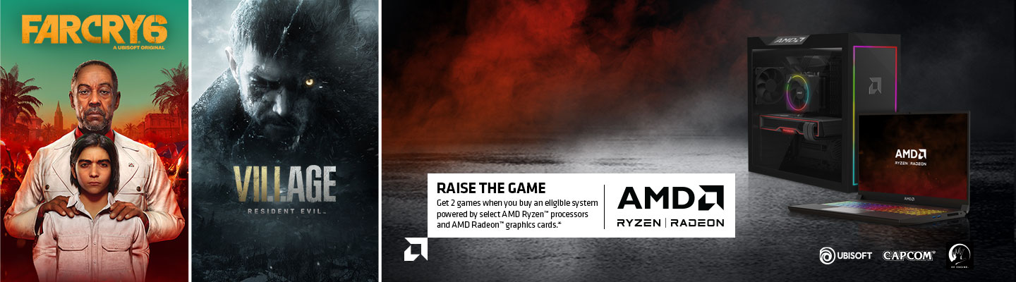 Fight for survival in Resident Evil™ Village Standard PC Edition or overthrow a ruthless dictator, starring actor Giancarlo Esposito, in Far Cry® 6 Standard PC Edition. Plus, sport an exclusive in-game AMD Radeon™ Baseball Cap and AMD Ryzen™ Tee in Far Cry® 6.